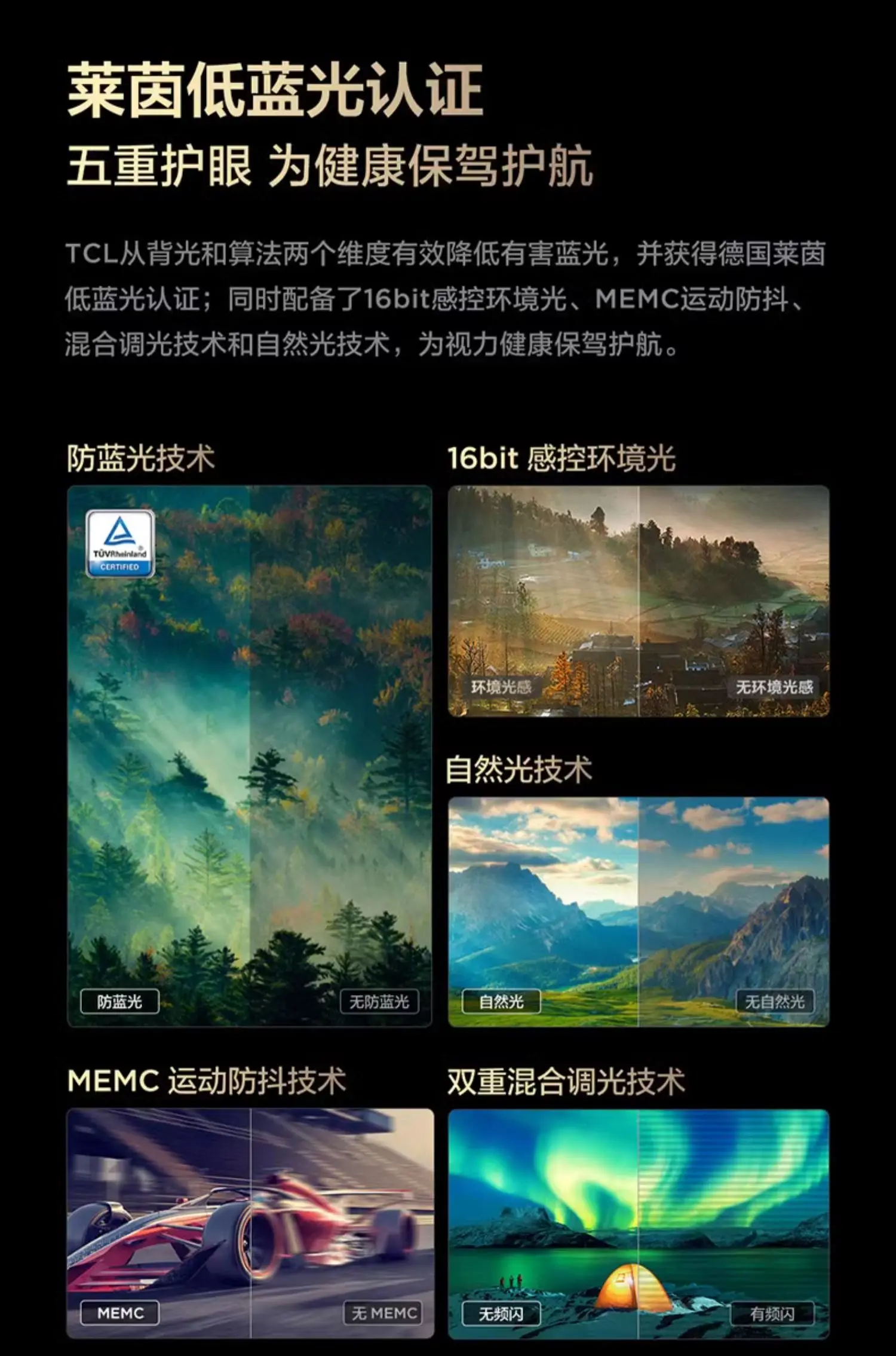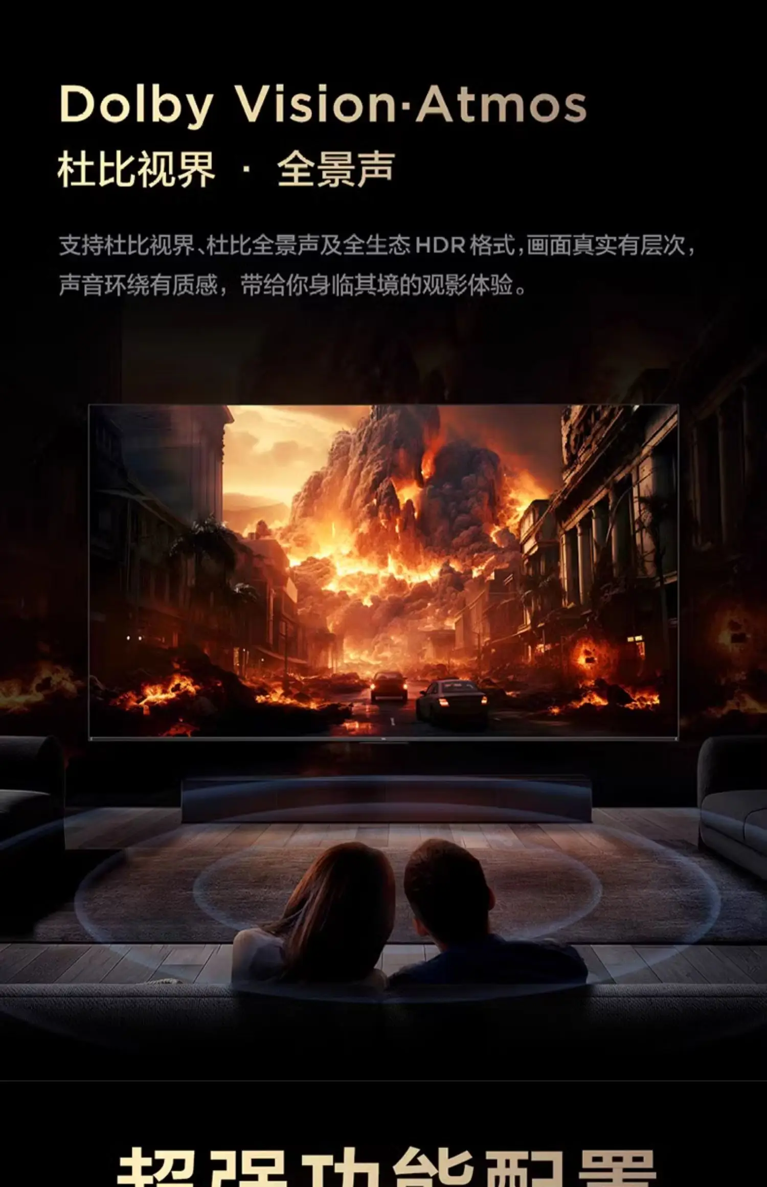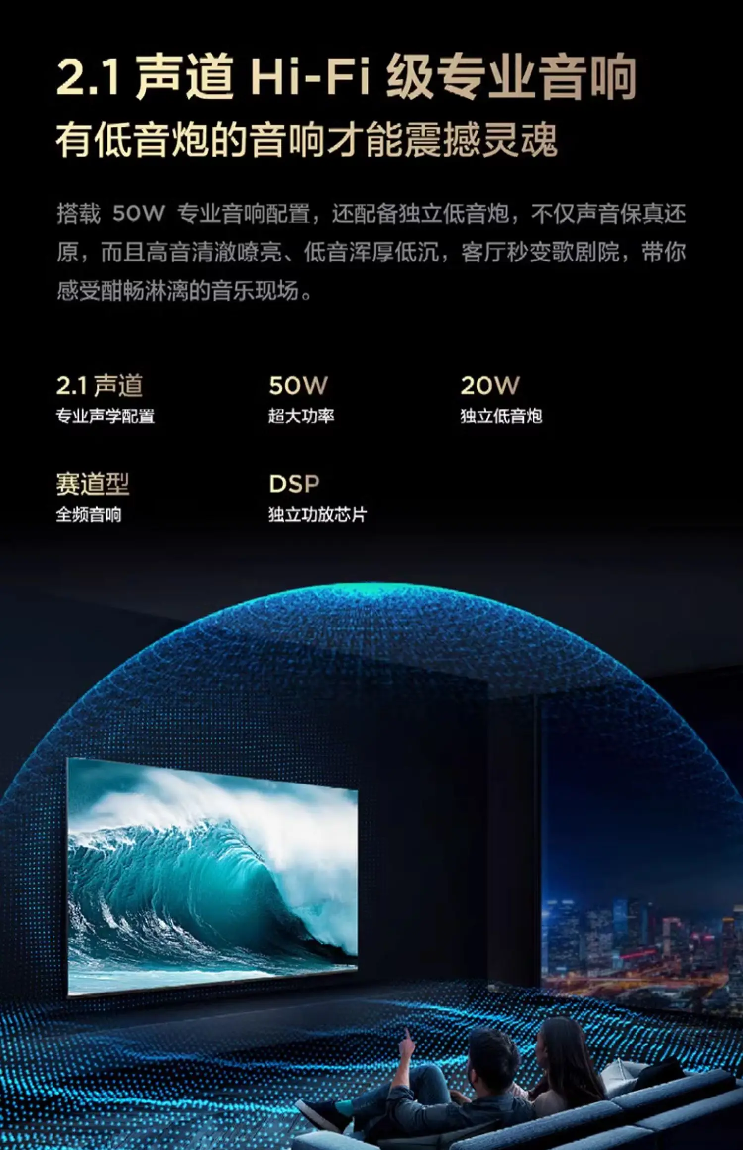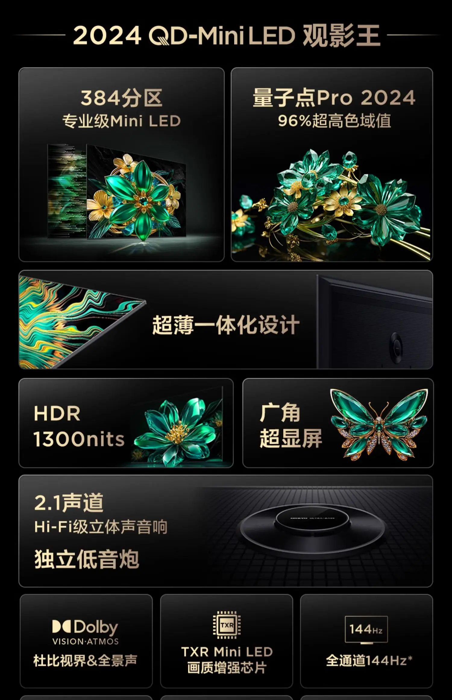 يدعم التلفزيون تقنيات Dolby Vision IQ وHDR10+ وHLG، بالإضافة إلى نظام صوت Hi-Fi من ONKYO بقوة 2.1 قناة مع دعم Dolby Atmos و DTS Virtual:X لتجربة صوت محيطية غامرة.