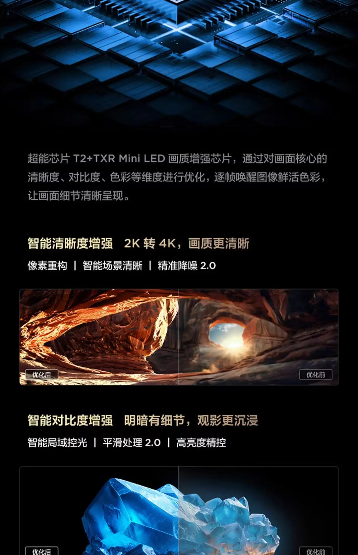 - تقنية الصورة: QD-Mini LED (مزيج من QLED و Mini LED) توفر تباينًا شبيهًا بـ OLED، ألوان أغنى، وسطوع أعلى.