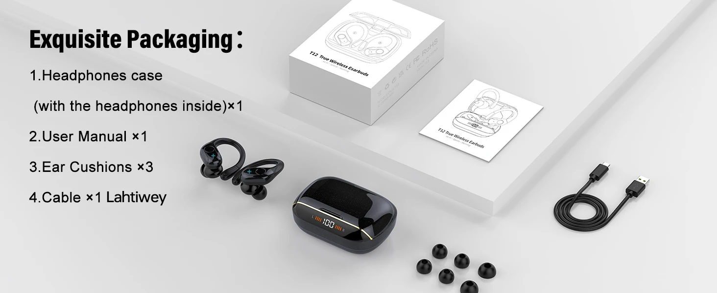 – سماعات بلوتوث – سماعات الأذن × 3 أزواج (L، M، S،)، تم تثبيت المقاس M مسبقًا – كابل من النوع C ×1 – حالة الشحن – دليل المستخدم ×1