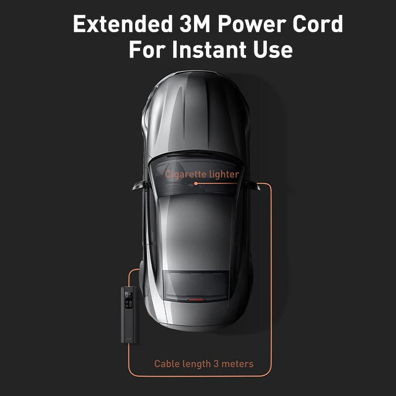 يأتي ضاغط الهواء Baseus 12V 150PSI بسلك طاقة بطول 3 أمتار.