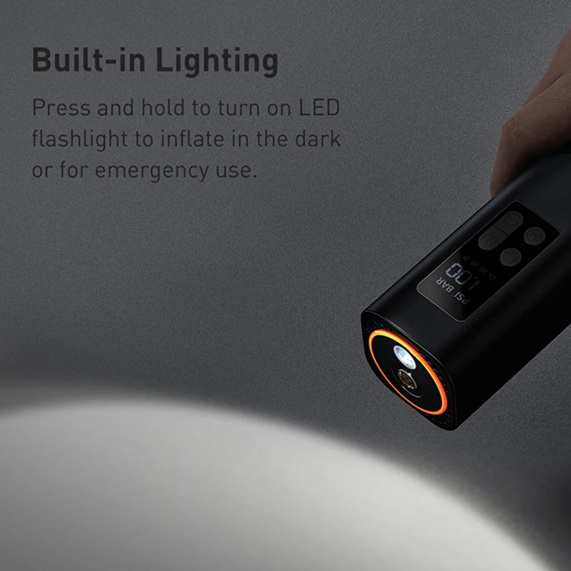 يحتوي الضاغط على مصباح LED مدمج. يمكن تشغيله بالضغط المطول، مما يساعد على النفخ في الظلام أو أثناء حالات الطوارئ الليلية.