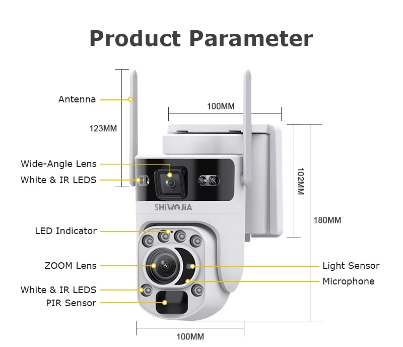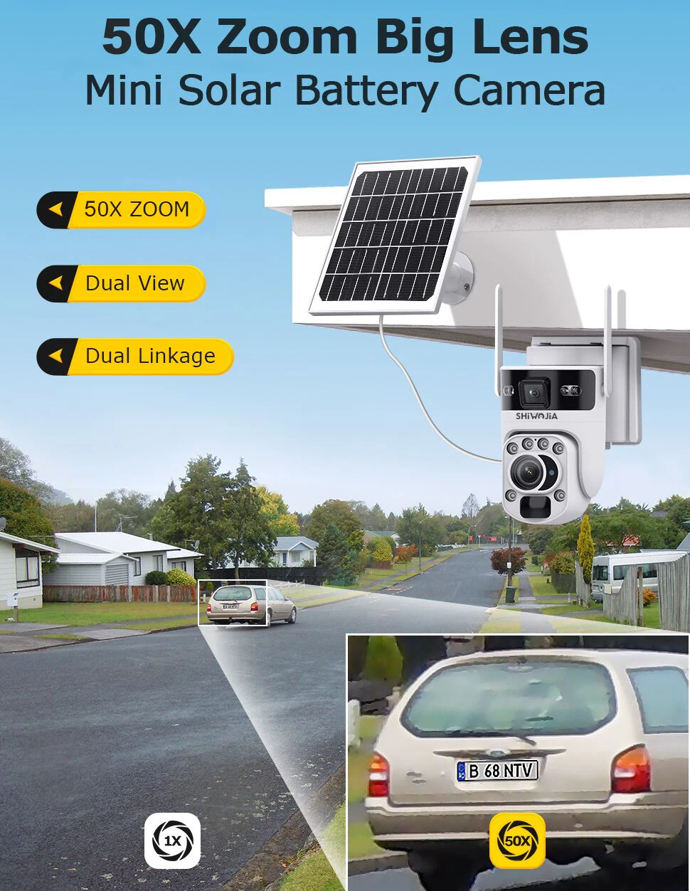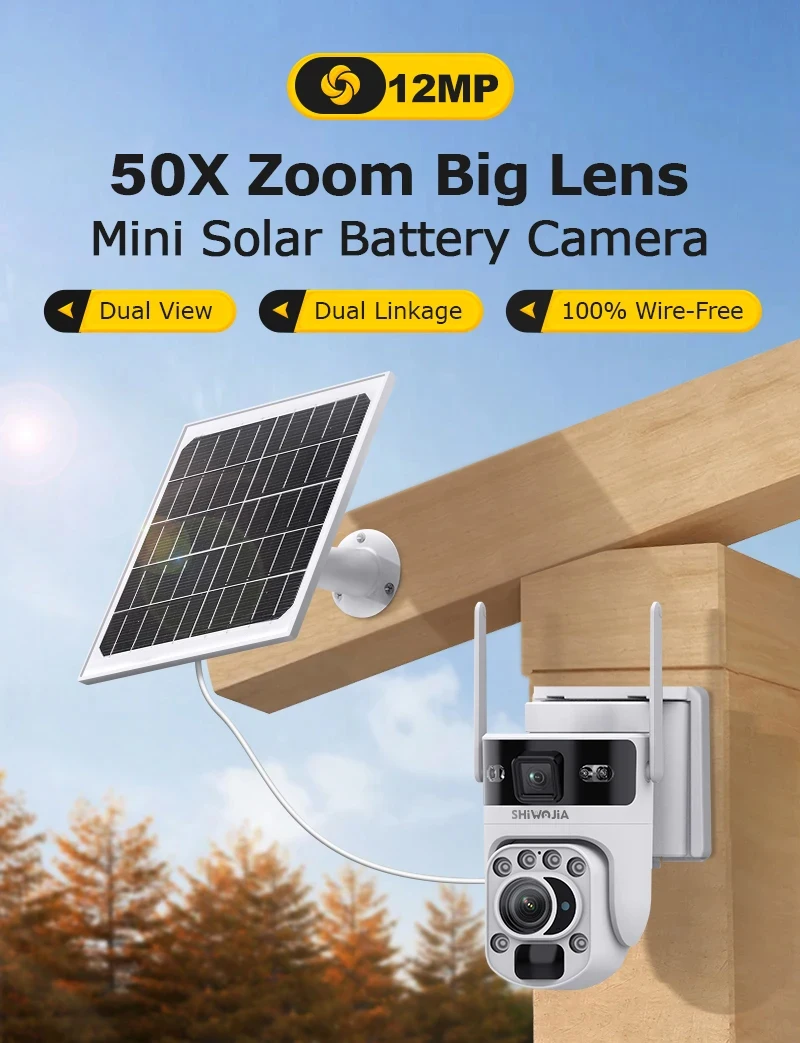 المميزات : 1.SHIWOJIA 6K 12MP 50X كاميرا تعمل بالطاقة الشمسية ZOOM بشاشة مزدوجة 4G 2.وحدة 4G مدمجة، وحدات مختلفة في بلدان مختلفة 3.عموم وإمالة: عموم 355 درجة وإمالة 100 درجة 4.لوحة شمسية 6 وات مع سلك تمديد 3 أمتار، مدمجة 10050 مللي أمبير في الساعة البطاريات 5.الاتصال الداخلي الصوتي في اتجاهين 6.التخزين السحابي وتخزين بطاقة TF بحد أقصى 256 جيجا (بدون TF البطاقة)، تدعم فقط بطاقة TF سعة 256 جيجابايت المقدمة من LS VISION 7.عرض/تشغيل شبكة 4G عن بعد عبر التطبيق (UBox) 8.بلوتوث + مسح إضافة شبكة تكوين QRcode 9.إنذار كشف الإنسان PIR + Ai وتسجيل الفيديو، كشف PIR المسافة: في حدود 12 مترا 10.يمكن ضبط وقت نشر التنبيه عدسة واسعة الزاوية 11.2.8 مم + عدسة PTZ بتكبير 5-50 مم 20x، رؤية واضحة من بعيد وقريب 12. ضوء الأشعة تحت الحمراء المدمج + الضوء الأبيض، رؤية ليلية بالألوان الكاملة أو وضع الأشعة تحت الحمراء اختياري، مسافة الأشعة تحت الحمراء 40 مترًا 13.Support تحديد المواقع ربط الفيديو المزدوج والبشر التلقائي تتبع 14.درجة مقاومة للماء IP66