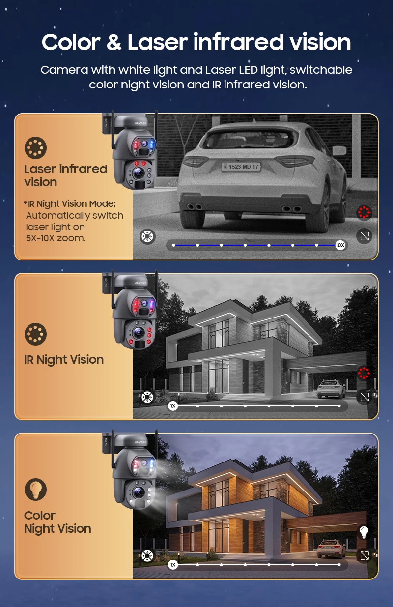 كاميرا ذات ضوء أبيض وإضاءة LED ليزر، رؤية ليلية ملونة قابلة للتبديل ورؤية بالأشعة تحت الحمراء.