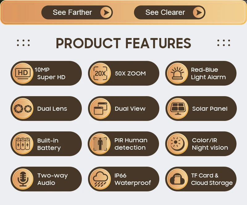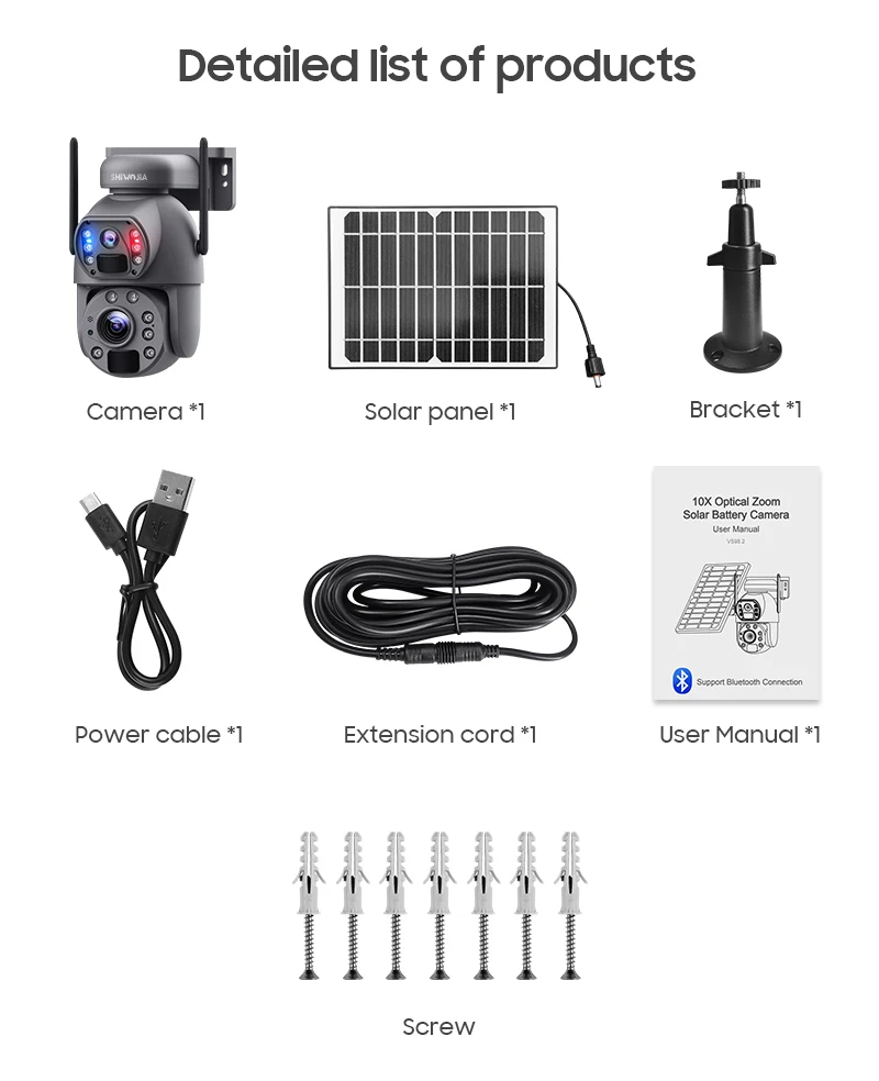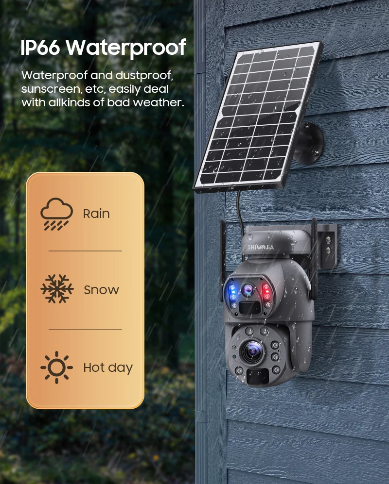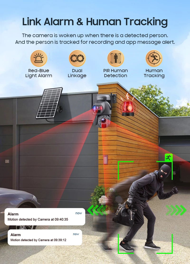 • مستشعر مزدوج: مع عدسة كاميرا رصاصية ذات زاوية واسعة للغاية + عدسة مزدوجة بتكبير 50x، وصورتين للمراقبة، وفيديو لمسافات طويلة واضح جدًا، ومسافة PIR حوالي 15 مترًا، ونطاق كشف أوسع. • كاميرا رصاصة: يمكن تعديل الاتجاه الأفقي يدويًا (يمكن أن تصل الزاوية ذات الدعامة إلى 350 درجة)، كاميرا ptz: تعديل كهربائي، اتجاه أفقي 350°الاتجاه الرأسي 90° • 2 قطعة أضواء الليزر: مسافة الرؤية الليلية أطول بكثير من أضواء الأشعة تحت الحمراء العادية، ومسافة الرؤية الليلية مرئية بوضوح تصل إلى 50 مترًا؛10 قطع من مصابيح الأشعة تحت الحمراء/الأضواء البيضاء: الرؤية الليلية من مسافة قريبة واضحة وبدون تظليل • دعم اتصال بلوتوث، الاتصال بسيط وسريع • لوحة شمسية من السيليكون أحادي البلورية بقدرة 6 وات، وبطارية ليثيوم مدمجة بقوة 12000 مللي أمبير • ميكروفون مدمج ومكبر صوت، يدعمان وظيفة الصوت في اتجاهين • استخدم معالج T40N عالي الأداء لتحقيق الكشف عن الإنسان + تتبع الإنسان (ملاحظة: يحتاج إلى العمل في المعاينة النشطة أو وضع التسجيل بدوام كامل) • يدعم الربط (كاميرا رصاصة لعرض فيديو بانورامي، وكاميرا pts للتكبير لعرض الفيديو الموسع في الموقع)؛ كما يدعم المراقبة المستقلة لكاميرتين، وكاميرا واحدة للأغراض المزدوجة